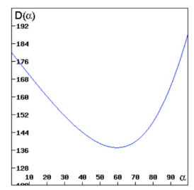 利用斯涅耳定律可以用α替代β,从而得出偏差角随α的变化关系(折射率定为1.33),为: