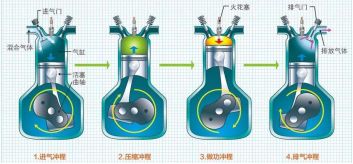 而想弄清楚这一点,必须先了解汽车发动机的原理(已经了解的小伙伴可以跳过这一段),如图一所示,常见的四冲程发动机原理如下:进气冲程过程中,曲轴旋转引起活塞向下移动,同时进气门开启,混合气体进入气缸;随后进气门关闭,随着曲轴的继续旋转,活塞向上运动使气缸内气体压缩;压缩的混合气体被火花塞点燃后开始燃烧,放出大量气体,气体体积急速膨胀,使活塞下移,引起曲轴快速旋转,连动汽车向前行驶,最后排出废气。如此循环,使得汽车连续向前行驶。