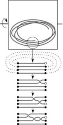 在这里,我们用一种比较直观的过程的方法来解释整个线缠绕的过程。如图所示,长的绳子在一个有限的容器内,为了适应环境,必须以一种卷曲的姿态待在容器里,这代表,绳子的一端会与其他部分平行排放,随着容器的晃动,绳子的末端有充分的机会上下翻滚并与其他部分缠绕在一起,从而形成不同的绳结。