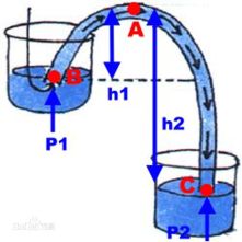 但当ρgh1 ≥ P,虹吸现象就会消失。此时管子中的水就会以A点为界线,左端往左流,右端往右流,中间形成一段真空层。对水来说,这个临界的高度值为10.3米,所以生活中一般观察不到这种情况。
