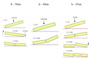 首先他选用长度为78mm,直径为11mm的粉笔,利用高速摄影机发现了粉笔从不同高度摔落在地上的不同现象:在低于30厘米的高处落下,粉笔一般不会摔断;在高度为30厘米到40厘米的高处落下,粉笔一般从中间断为两截;在40厘米以上的高出落下一般断为不相等的三截;在高于50厘米的高度落下,偶尔会断为不相等的四截。如图所示: