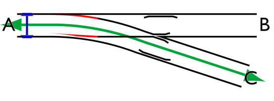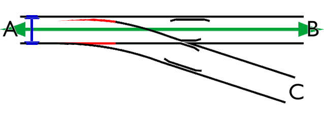 下面以单开道岔为例,当想让火车由A到B时,就拨动尖轨(图中红色部的分)让它像图1中那样放置。火车左轮不与尖轨接触,直接向B方向行驶,但是右轮因为有轮缘的存在,被尖轨引导至向B方向行驶,从而使火车直行。当想让火车由A到C时,拨动尖轨,让它像图2中那样放置。这时,火车右轮不与尖轨接触,因此沿着铁轨向C方向行驶,而左轮被尖轨引导,也向C方向行驶,从而实现了火车变轨。