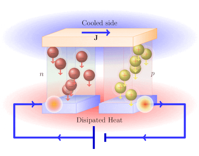那为什么会有这么神奇的效应呢?主要原因在于载流子(金属中的电子、半导体中的电子和空穴)在传导的时候会携带热量。当金属或者半导体两端有温度差的时候,热端的载流子扩散速度更快,就会在冷端形成电荷聚集,正是这个电荷聚集导致了电势差。反过来,当你给一个金属或者半导体两端加上一个电压,载流子的单向流动也会导致热流动从而形成温度差。