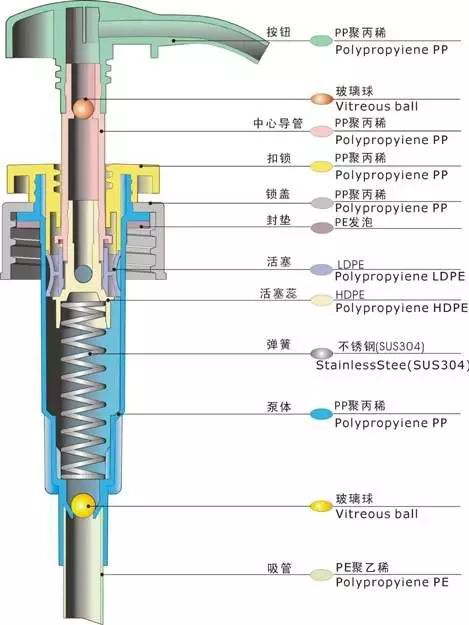 洗发水喷头的正式名字叫做“乳液泵”。乳液泵的内部构造见下图: