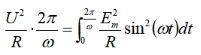 在上述情况中,消耗的电能变为热能Q,单位时间内产生的热量等于电压的平方除以电阻,对于正弦交流电来说,其电压E=Emsinωt,周期T=2π/ω。正弦交流电的电压在随时间变化,要计算其一个周期产生的热量需要进行积分。我们假设直流电的电压为U,电流通过的电阻而R,则有: