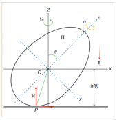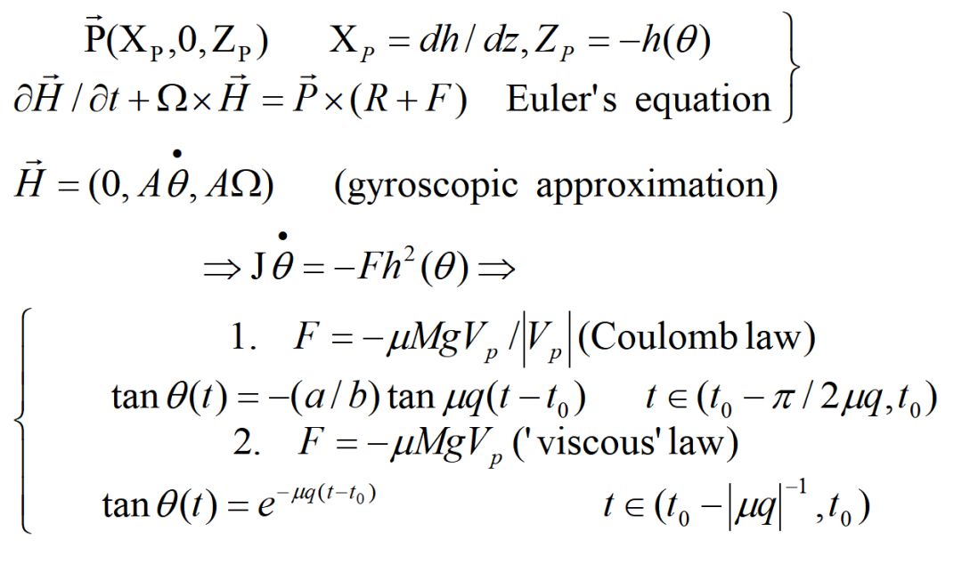 首先建立如图所示的模型,从解析的角度来计算鸡蛋旋转对称轴Oz和竖直轴OZ之间角度随时间的变化θ(t)。采用陀螺近似,利用欧拉角动量方程,得到夹角一阶微分方程,在两种不同形式的摩檫力下得到了相同的结论:在鸡蛋的几何形状满足一定条件时,一段时间内,鸡蛋旋转对称轴Oz和竖直轴OZ之间的夹角单调的从90度变为0度,解释了魔蛋重心上升的现象。同时,在摩檫力为零时,角度不随时间变化,鸡蛋重心不会上升。据此,桌面与鸡蛋接触点的摩檫力是鸡蛋重心上升的关键因素。鸡蛋开始水平旋转时,由于鸡蛋形状的特殊性(一头大一头小,tip-top),这个位置并不稳定,蛋壳或桌子上任何微小的不规则都会使鸡蛋略微倾斜。旋转使得鸡蛋在桌面上滑动,将末端向上推,接触点靠近底端。接触点线速度增大,增加了摩擦力,使得鸡蛋能够在这个角度下稳定;鸡蛋继续旋转,接触点更靠近底端,摩檫力继续增大,最终,这种摩擦将鸡蛋一直“推”到垂直位置。
