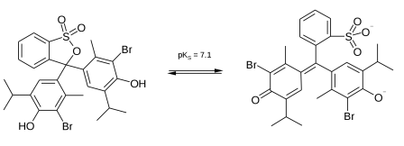 比如高中生物书上用来检测二氧化碳的溴麝香草酚蓝,属于弱碱,它在pH低于6.0时显黄色,pH高于7.6时显蓝色。下面的方程式展示了溴麝香草酚蓝发生转变时的结构变化。