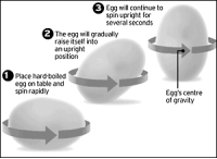 当我们让一个煮熟的鸡蛋快速旋转起来的时候,它的重心会逐渐上升,直到立着转一段时间,随后中心逐渐下降,直到停止。由于鸡蛋这种奇特的现象,形象称之为“魔蛋(magic eggs)”。