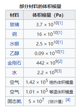 水的体积弹性模量为2.19x109Pa,即21.9MPa的压力可以使水的体积压缩相对1%,远大于气体的体积模量。