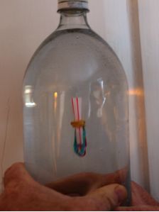 浮沉子主要用了两个原理,一个是帕斯卡原理(静压传递原理),一个是阿基米德原理(浮力定律)。先看一下简易浮沉子的构造吧,见下图,吸管的下部别着几根回形针,用来增加质量,而吸管的上部留着一些空气。吸管能浮在水面上就是因为上部留有的空气。