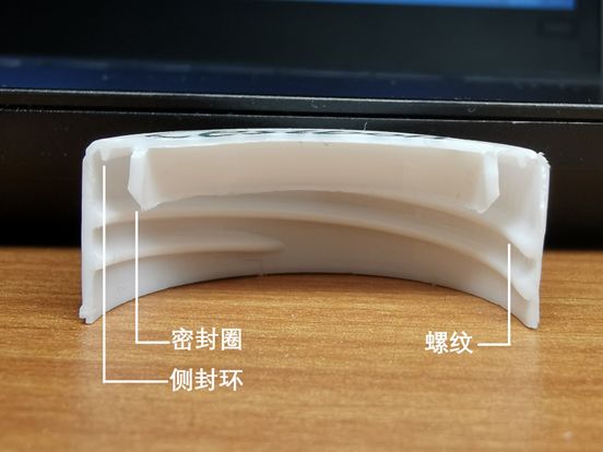 在瓶盖拧紧后,瓶口会牢牢顶住瓶盖,并卡在密封圈与侧封环之间,密封圈伸进了瓶口,增加了密封面积。此外从结构图可以看到,密封圈延伸出去部分的半径要大于底部半径,并且末端还带有一定弧度,这使得其更好与瓶口内沿接触,达到密封的效果。侧封环与瓶口外沿紧密接触,阻挡了瓶外物质对瓶内的渗入。橡胶圈具有一定的弹性,在和瓶口接触后可以实现软密封,因此一般带有橡胶圈的容器密封效果会更好。瓶盖的内螺纹和瓶口的外螺纹接触挤压,其主要作用在于产生摩擦力矩,使瓶口牢牢顶住瓶盖而不会轻易松动。