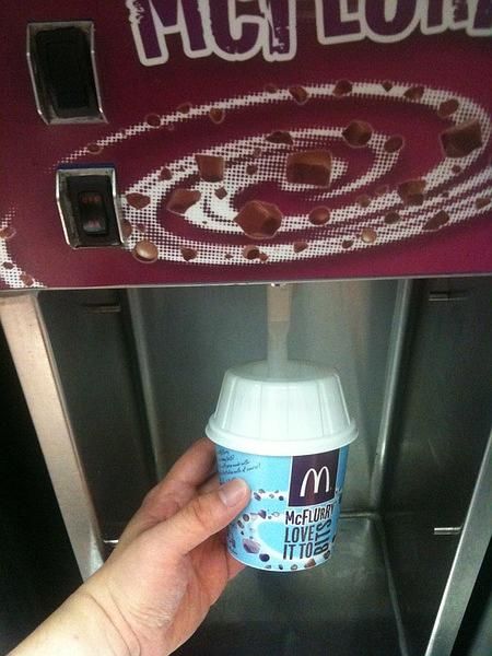 注意啦,下面是敲黑板划重点的时候啦!麦旋风的勺子为什么要设计的这么奇怪呢?如图,就是这个用法,麦旋风勺子的洞是用来和机器上的接口固连的,便于搅拌用。当然作为物理所的吃货是不会告诉你们这个管其实是用来吸我们那美味的麦旋风的啦!