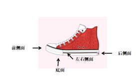 对于这个问题,我们首先要弄清楚鞋面上水的来源,首先必须要排除直接落到鞋面上的雨水、雨水直接浸润以及走路过程中另一只脚溅落的水滴影响,然后把鞋简化为一个六面体,如图所示,可以附着水滴的鞋的部位还有左右侧面、后侧面、底面以及前侧面。