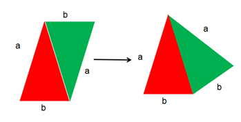 对于四边形结论就更明显了,如图,将四边形从对角线划为两个三角形,将其中一个三角形调转方向,就可以得到边长和面积都相等的两个不同的四边形了。