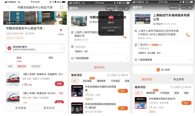 在途虎养车APP、天猫养车的门店优惠活动、以及京东的线下合作安装点界面上,两家店的美容洗车/维修保养活动、以及服务评分均处于展示之中。