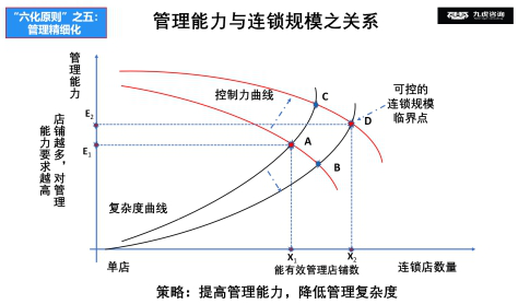 能有效管理店铺的数量是有限度的,与连锁企业的管理能力及其复杂程度有关。也就是说,有效管理店铺数有一个临界点,超过这个临界点就不能有效控制,连而不锁,企业秩序混乱,效益下降。