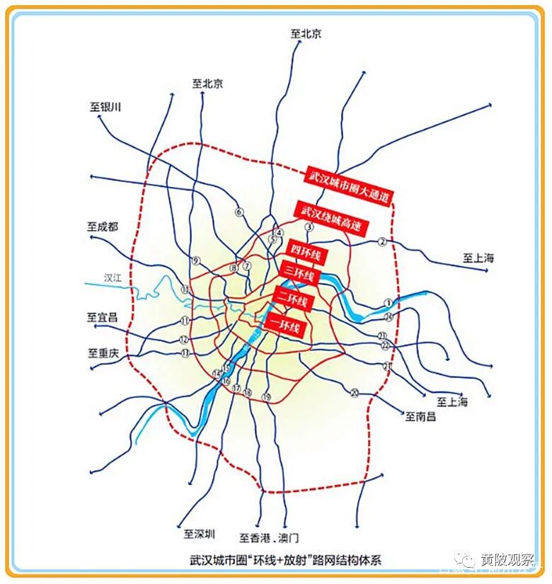 这24条射线中,包含了17条高速路,1条快速路和6条城市主干道,城市主干道中又包括了沿江的左岸和右岸大道的3条,107国道、高新大道和武昌大道。