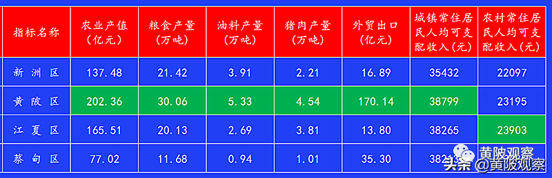 黄陂居于第一的指标还还有农业产值、粮食产量、油料产量、猪肉产量、外贸出口、城镇人均收入等6项。