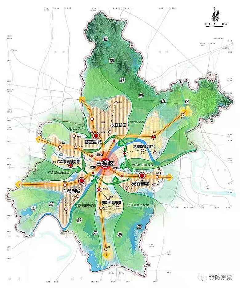 西北黄陂-孝感发展轴、西面东西湖-孝感发展轴,西南车都发展轴、南部发展轴、东部光谷-鄂州发展轴、东北新洲-麻城发展轴