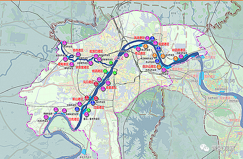下图为武汉港区分布图,武湖港赫然在列(图上蓝色船锚标记为集装箱码头,级别最高,紫红色船锚标记为散货、杂货码头),目前来看还以散货为主,未来也将会发展集装箱运输。
