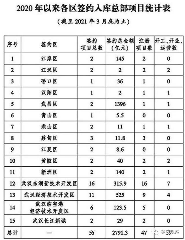 黄陂区引进了2家总部,签约总投资额40亿,在武汉15个统计区域中居于第7位。