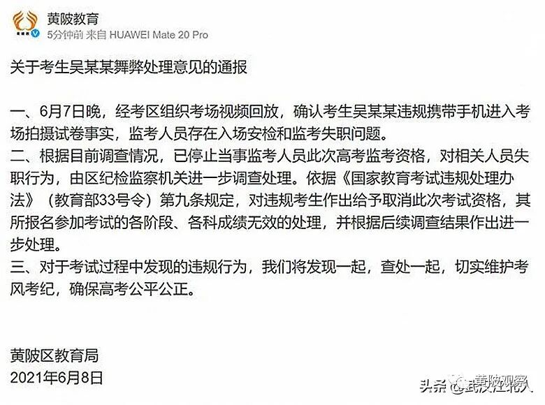 今天很热门的一则消息,昨天高考下午考数学时,在武汉市黄陂区7中考场,有学生带手机进考场,且拍下数学试卷上传至某辅导APP,被英明的管理人员发现后截图上报,今日黄陂区针对此做出回应,上传试题的考生被取消考试资格,相关考场的监督人员因失职被取消监考资格并接受调查。