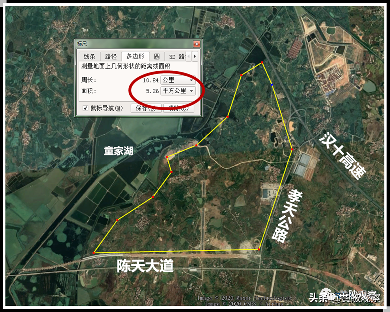 在卫星地图上,小编按照文件里说的方位测量了一下,此区域和黄陂2035规划图上基本一致,四至范围大致如下:北邻陈天大道,东边是孝天公路,北面为汉十高速,西边则是童家湖