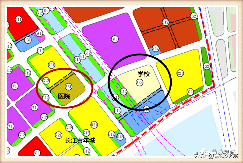 图上颜色标识是这样的:黄色是住宅区,红色是商务商业用地、酱黄色是批发用地、紫红色是物流仓储用地、浅蓝色是市政设施用地、浅黄色是学校用地,粉红色是文化用地、绿地是公园和绿地等,这个很重要,了解了颜色代表的土地性质,才能真正看懂规划要说明的内容;