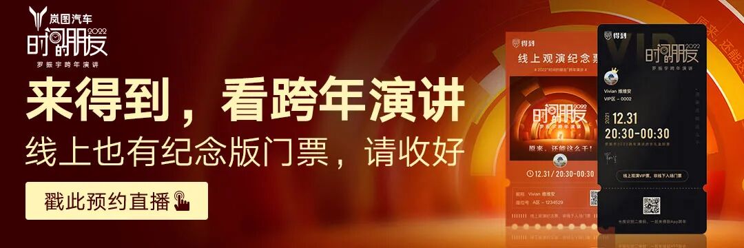 罗振宇2022“时间的朋友”跨年演讲线上直播预约通道已正式开启。今年,除了深圳卫视、抖音、西瓜视频和今日头条,你还能直接通过得到App或得到网页端(Dedao.cn)进行线上直播观看。我们还给线上观众准备了纪念版门票,每个人都拥有独一无二的座位编号,并能在得到知识城邦找找你的邻座。12月31日20:30,得到陪你一起跨年!