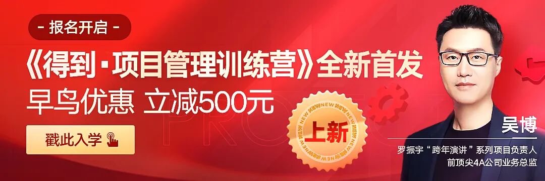为你推荐重磅产品《得到·项目管理训练营》,主理人吴博老师,是“时间的朋友”跨年演讲的总指挥。在21天的学习里,吴博老师将与你分享一套完整的项目管理思路,拆解上百类行业棘手难题,帮你成为一名专业、成熟的项目经理。推荐你加入,让你的职场晋升更进一步。
