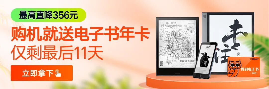 7月31日前,只要购买「得到阅读器」,就可以免费获得价值199元的电子书会员年卡或35元的会员月卡,55000+本好书免费畅读,拉满你的阅读体验。活动仅剩11天,千万不要错过。