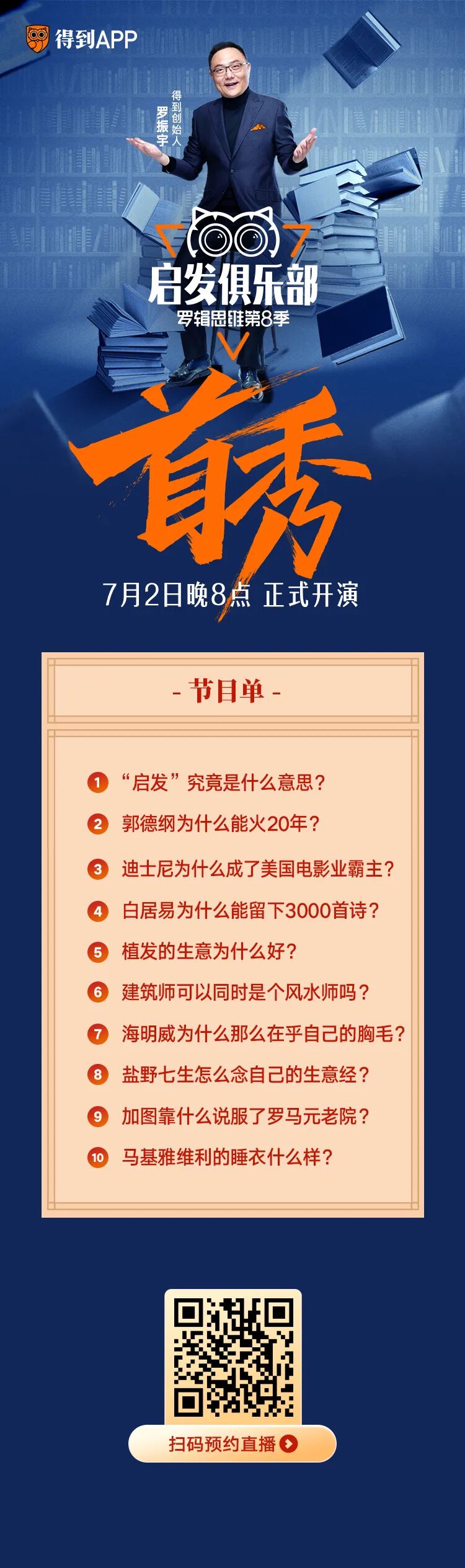 4. 它的首场演出,就在今天晚上八点,你可以在得到App里看到直播。欢迎你来捧场。你可能有一个疑问,大家现在都在往线上跑,这罗胖为啥非得反过来往线下走呢?恩,今天晚上直播的时候,我解释给你听。