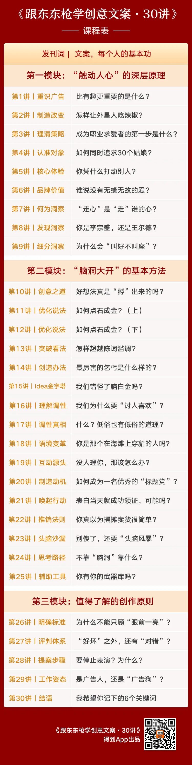 1. 这个周五上新,给你推荐我们「得到」里面的最新课程《跟东东枪学创意文案》。你可能会说,我又不是做广告的,我干嘛要学创意文案?