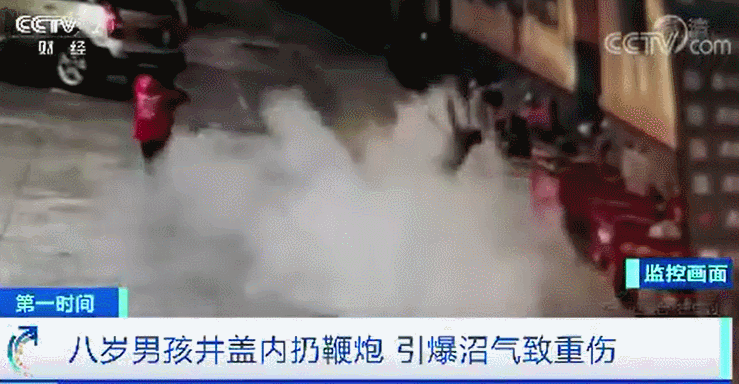 1月10日 在甘肃敦煌市的一个小区内 一名八岁男孩和同学一起放学回家 在回家的路上男孩随手向井盖内扔了个爆竹结果引起沼气爆炸孩子瞬间被炸飞的井盖掀飞重重摔落在地上,造成重伤