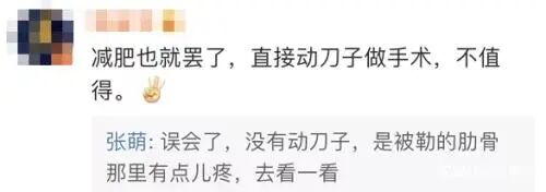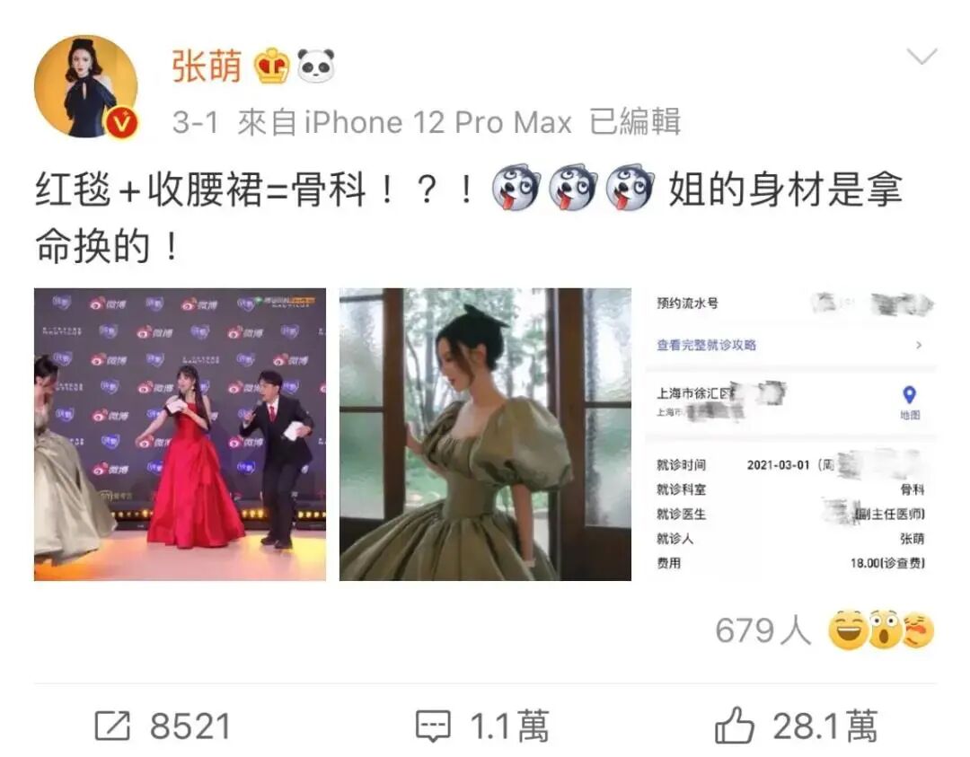 没想到一语成谶,(我不是乌鸦嘴,真不是)次日张萌就发微博说自己去看了骨科医生,原因是被收腰裙勒得“肋骨那里有点儿疼”。