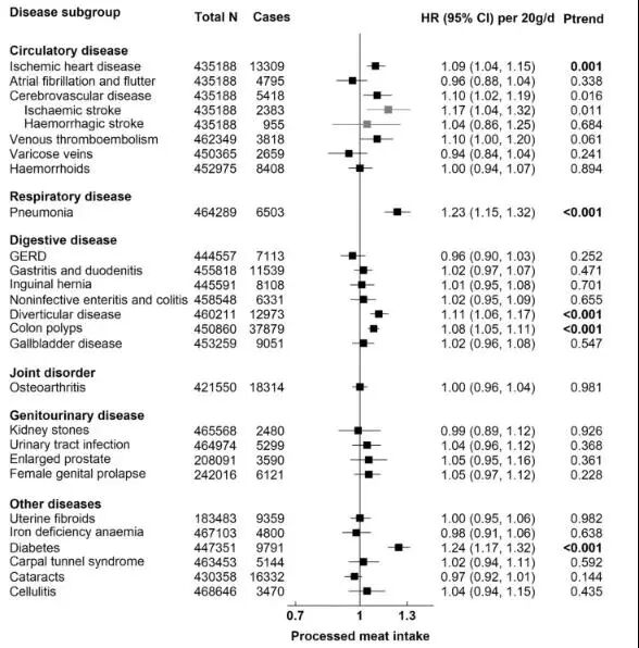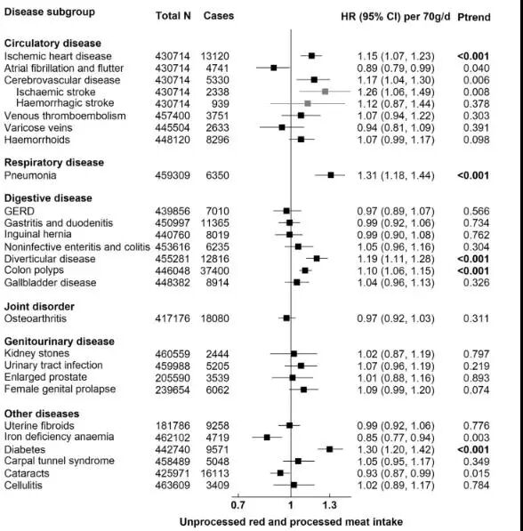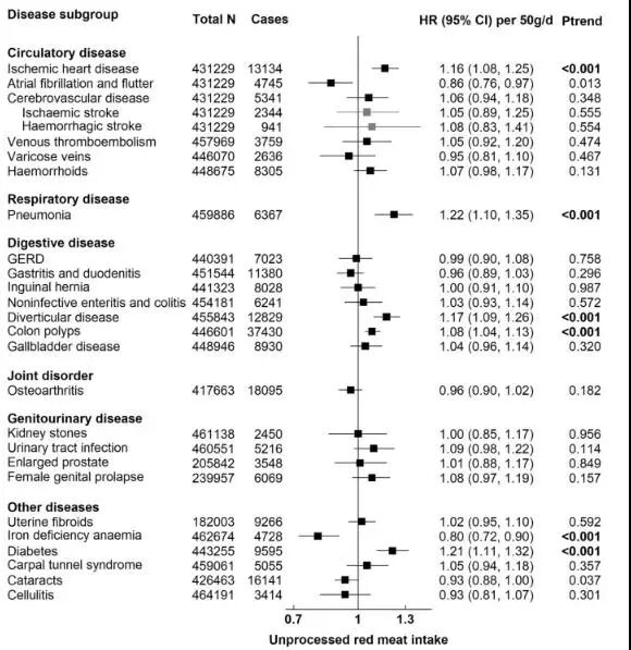 在随访期间,统计了受试者25种疾病的发病情况,包括循环系统疾病、呼吸系统疾病、消化系统疾病、泌尿生殖系统疾病、关节疾病以及其他疾病。研究人员发现,未经加工的红肉、加工肉、家禽肉摄入量与多种疾病风险相关:
