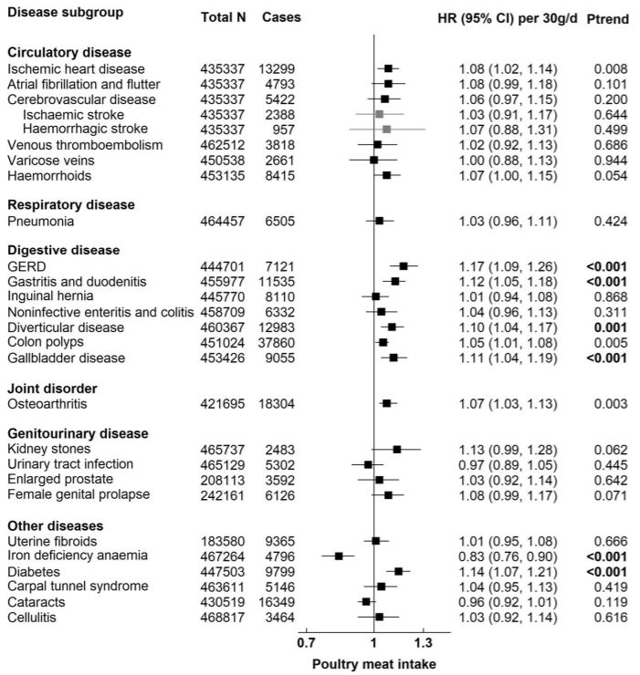 较多的禽肉摄入与胃食道反流病、胃炎和十二指肠炎、憩室病、胆囊病和糖尿病的较高风险相关;