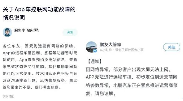 事发当晚,两家车企发布公告称,是运营商网络出现了问题,导致出现车辆APP运行异常、车机无法上网、也无法寻找充电桩的问题,正在和运营商合作加快网络修复。