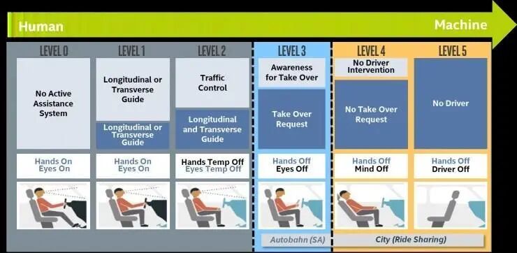 L0到L5是一个漫长的过程,当前绝大部分汽车厂商处于L2阶段,奥迪A8据说可以实现L3级自动驾驶。从L0到L2相对容易,但L3和L4的难度系数会几何上升,但即便到了L4,仍然是需要人类驾驶员的。当自动驾驶能力达到L5,就不需要驾驶员了,不仅不需要驾驶员,连方向盘、油门、刹车等东西统统不需要了,这时候才实现了真正意义上的无人驾驶,是目前所有企业努力的方向。