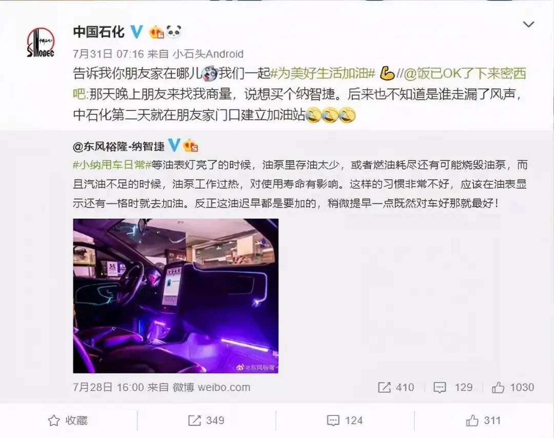 以上几个还是网友的自娱自乐,直到有一天……中石化的一次破壁互动,让它的“两桶油官方合作伙伴”的称号得到了实锤。