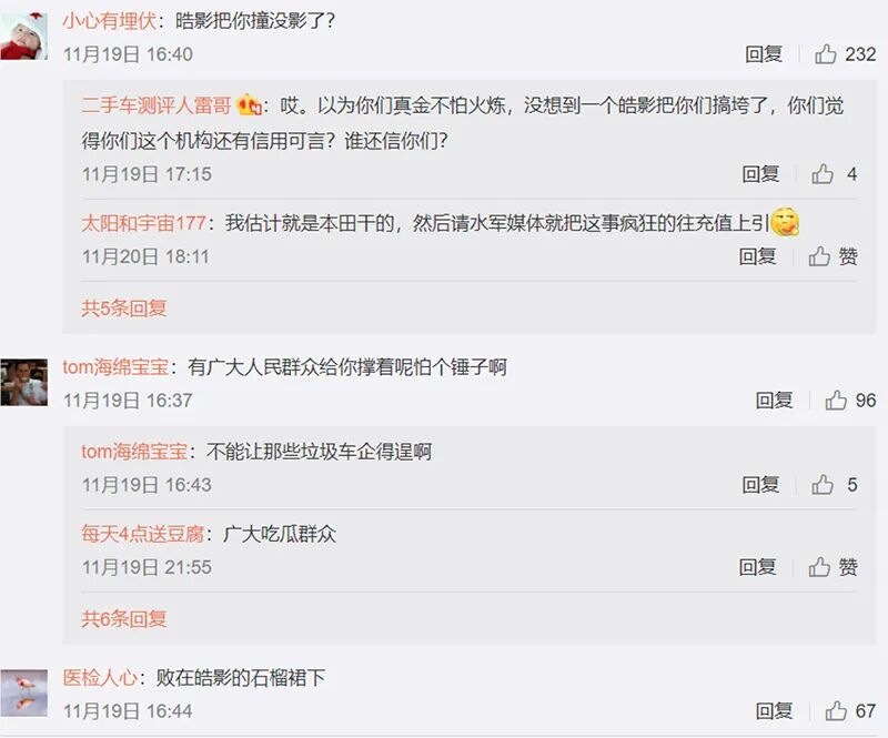 不过热心群众仍然时刻关注中保研的进展,在11月19日中保研的微博下,有网友留言,“报警的事破案了没?”“皓影让你们带薪休假半年了啊”,“哎。以为你们真金不怕火炼,没想到一个皓影把你们搞垮了。”“继续撞大众撞本田,别怂啊”“有广大人民群众给你撑着呢,怕个锤子啊。”
