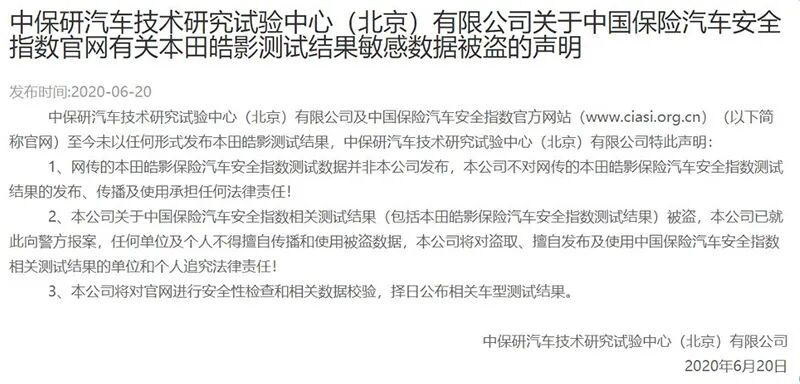 就在网上一片质疑的时候,中保研官网抛出声明:本田皓影的正式结果并没有发布,此前发布的内容并不代表官方。包括本田皓影测试结果在内的敏感数据被盗,公司已经报案了,将对官网进行安全性检查,择日再公布本田皓影的结果。