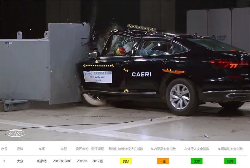 去年12月,中保研全面公布了帕萨特的相关碰撞测试评价,显示在正面25%偏置碰撞测试中,帕萨特A柱出现近90度的弯折,几乎折断,且主驾驶框架已经明显变形,加上参与测试的车型没有侧气囊,导致车内假人的头部两次与车内硬结构发生了碰撞,假人的头部、颈部、腿部、脚部均受到了较大伤害。在该项目中得到了P较差评价。