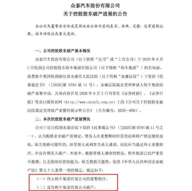 12月23日,众泰汽车发布公告称,公司于近日收到永康法院下发的《民事裁定书》,据内容显示,其母公司(实控人)铁牛集团由于已经严重资不抵债,且无继续经营的能力,缺乏挽救可能性。