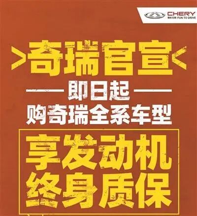 本月初,奇瑞汽车对外官宣,其品牌旗下全系车型推出“发动机终身质保”,并且从2020年元旦起,购买奇瑞汽车的用户,也能享受同等的质保政策。