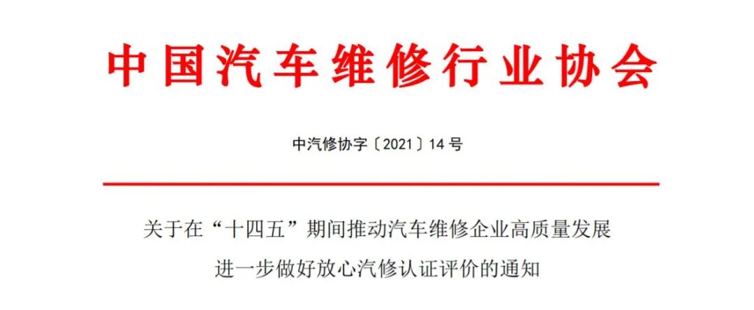 近日,中国汽车维修行业协会下发关于在“十四五”期间推送汽车维修企业高质量发展进一步做好放心汽修认证评价的通知。