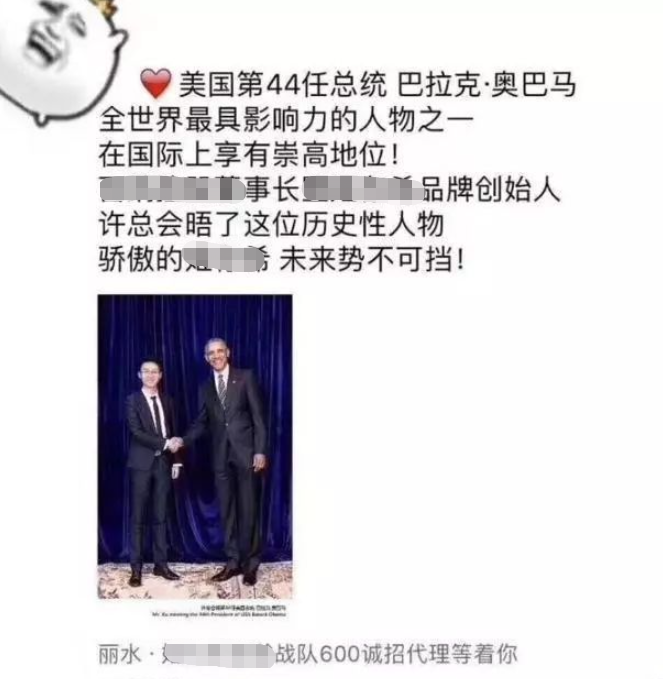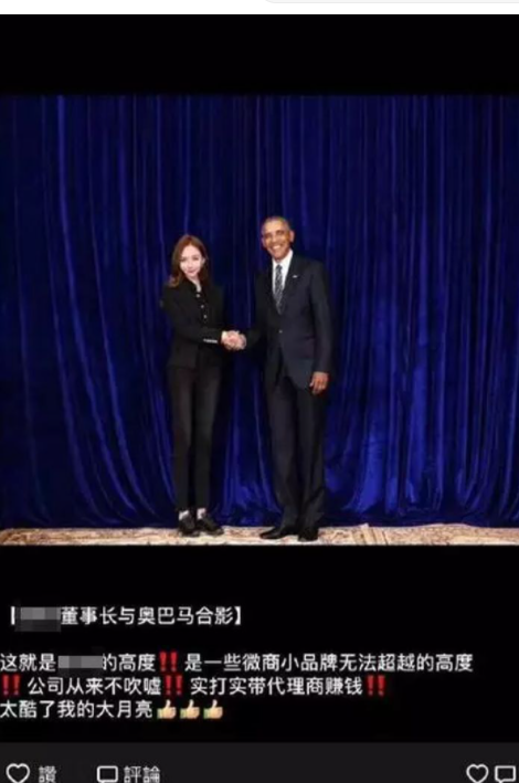奥巴马是真的奥巴马,合影也是真的合影。只不过不是因为他们微商团队做得大做得强,所以可以“会晤”奥巴马,而是因为他们交钱了。