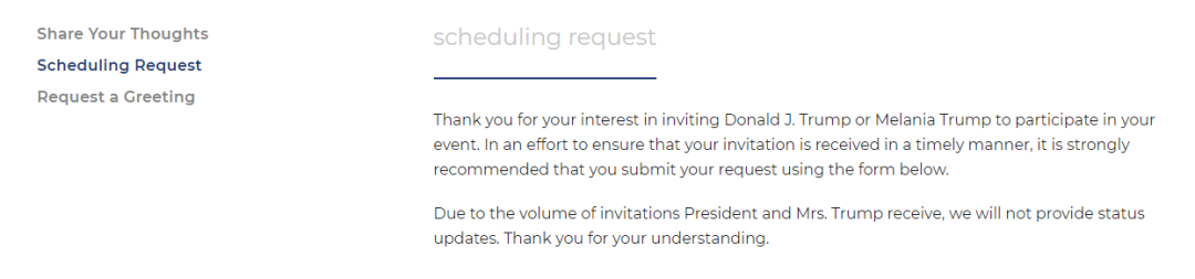 感谢您有意邀请唐纳德·J·特朗普或梅拉尼娅·特朗普参加您的活动。为了确保及时收到您的邀请,强烈建议您使用以下表格提交您的请求。