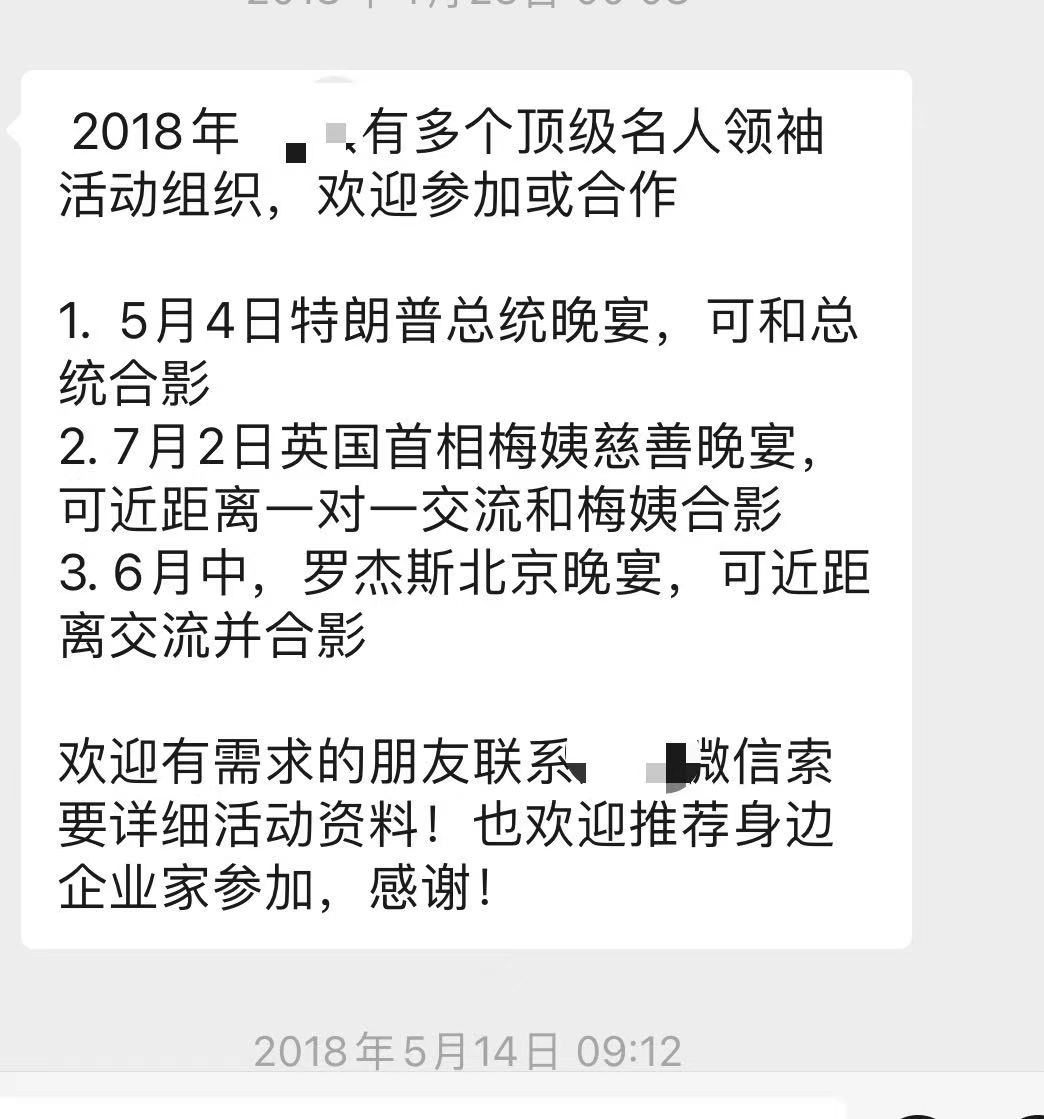 疫情之前,常常能收到他在朋友圈发的广告或者群发的微信,说哪个哪个名人又办晚宴了,只要花钱,就能在晚宴的C位和这些名人合影。
