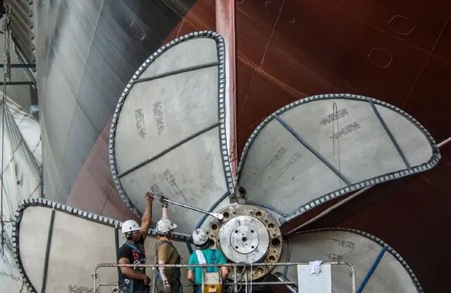 径大多为6米左右,重量也在几十吨上下。螺旋桨的质量和直径相比于航母本身的体积和重量还是相对较小的。当然有的航母上还会设计和安装多个螺旋桨,以提升航母的推动力,加快航行速度,以及缩小转向半径。航母的螺旋桨和航母本身相比虽然不大,可如果是单独将它拿出来,直径长达6米,相当于两个房间的长度,